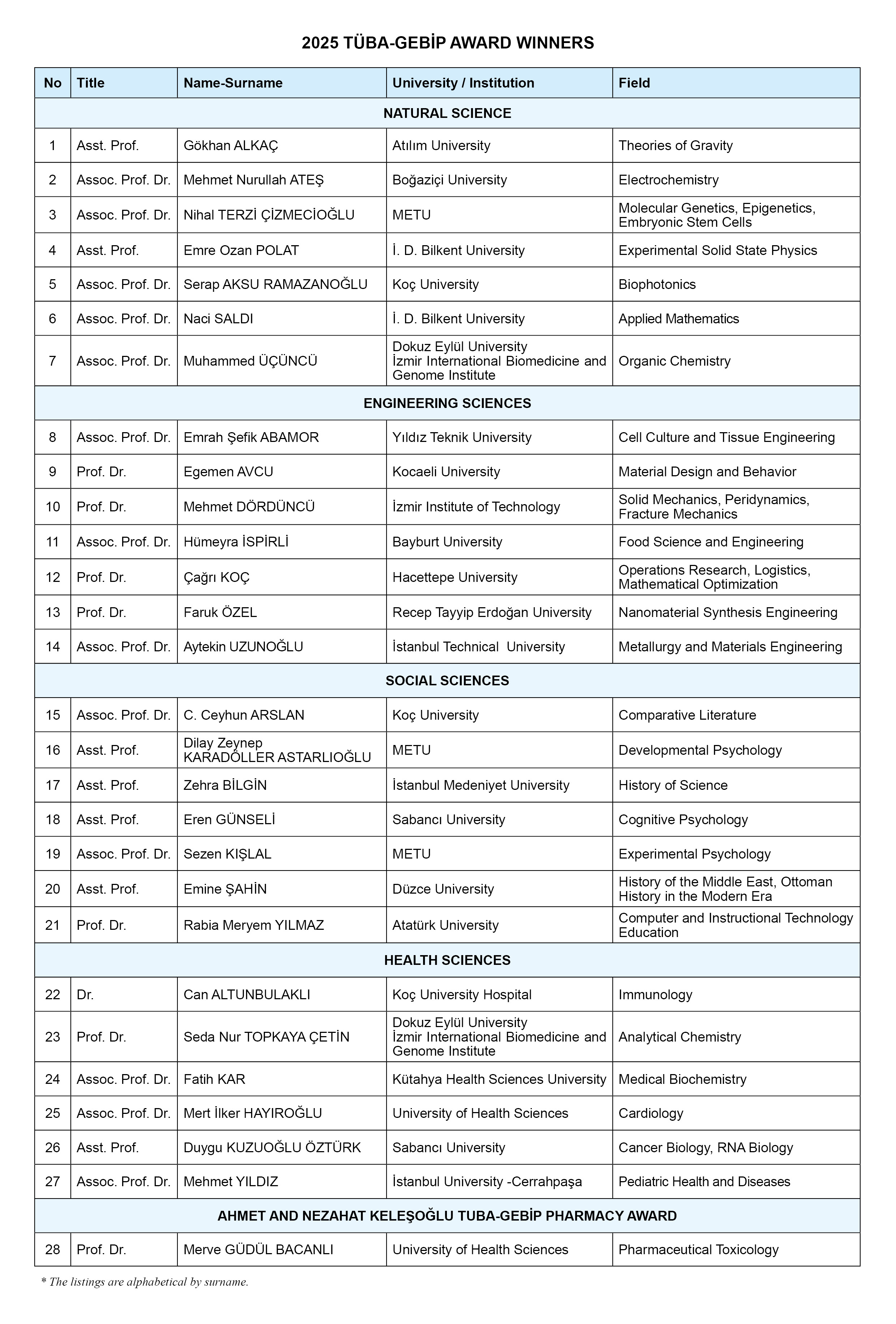 In 2025, 28 outstanding young scientists won the TÜBA-GEBİP Award, which is given annually as part of TÜBA's mission to encourage, recognize, and reward scientists, including the Ahmet and Nezahat Keleşoğlu TÜBA-GEBİP Pharmacy Special Award. Thus, the number of scientists who have won the TÜBA-GEBİP Award to this date has risen to 697.
