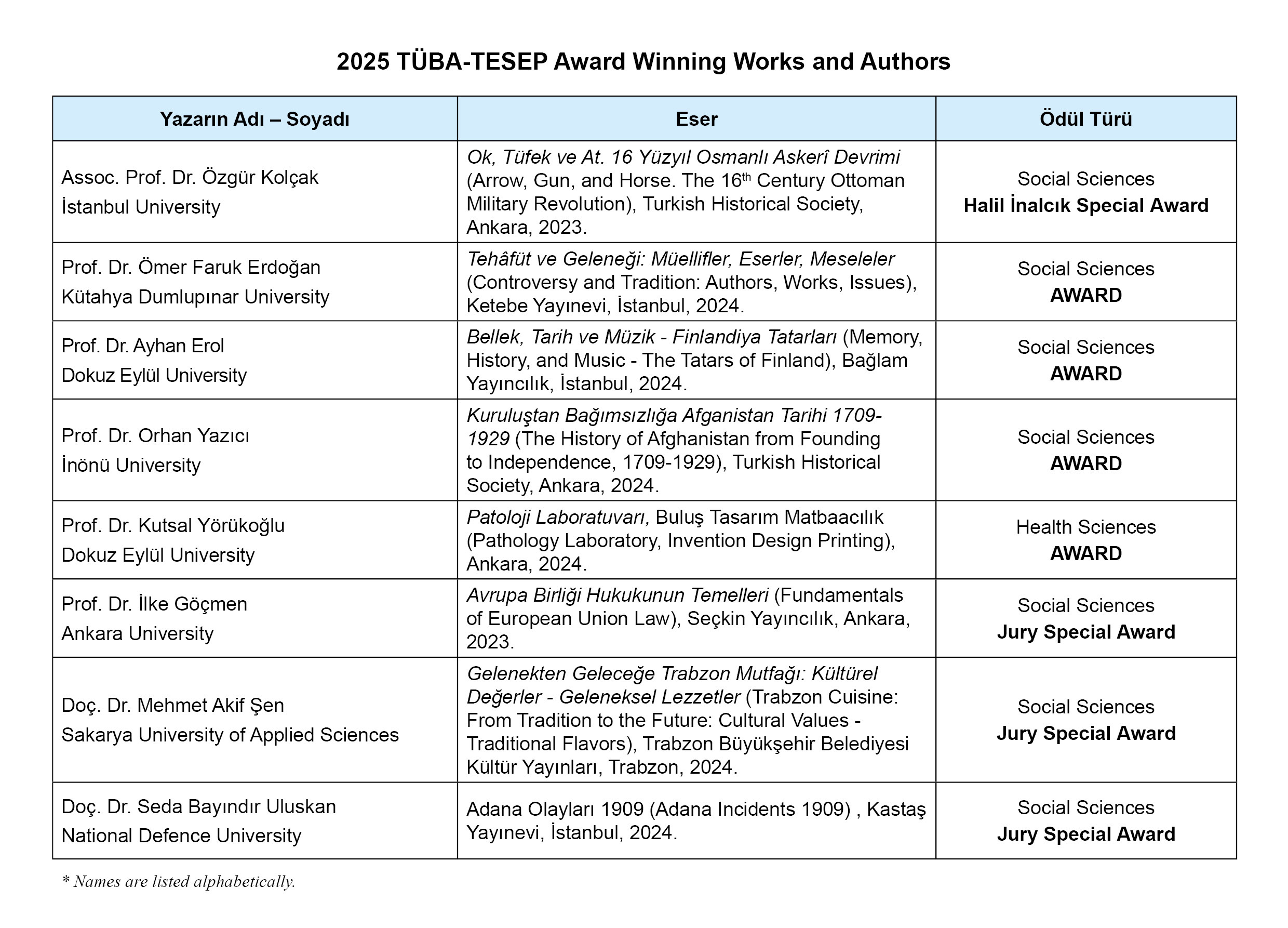 Under the auspices of the Presidency, “TÜBA Awards” consisting of TÜBA International Academy Prizes, TÜBA-GEBİP Award (Outstanding Young Scientist Awards) and TÜBA-TESEP Award (Scientific Authored Book Awards) have found their owners. All awards will be presented by President Recep Tayyip Erdoğan at the TÜBA-TÜBİTAK Science Awards Ceremony to be held at the Presidential Complex on December 23, 2025.