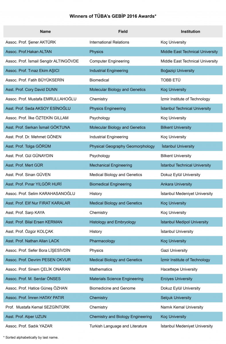 105 applications were received for the 2016 GEBİP program in the fields of natural sciences, engineering sciences, health sciences and social sciences, and 31 scientists, named below, were granted awards. Award winners will receive an annual grant of 20 thousand Turkish liras for 3 years, and doctoral students in the process of writing their dissertations will receive an additional grant of 6 thousand liras.