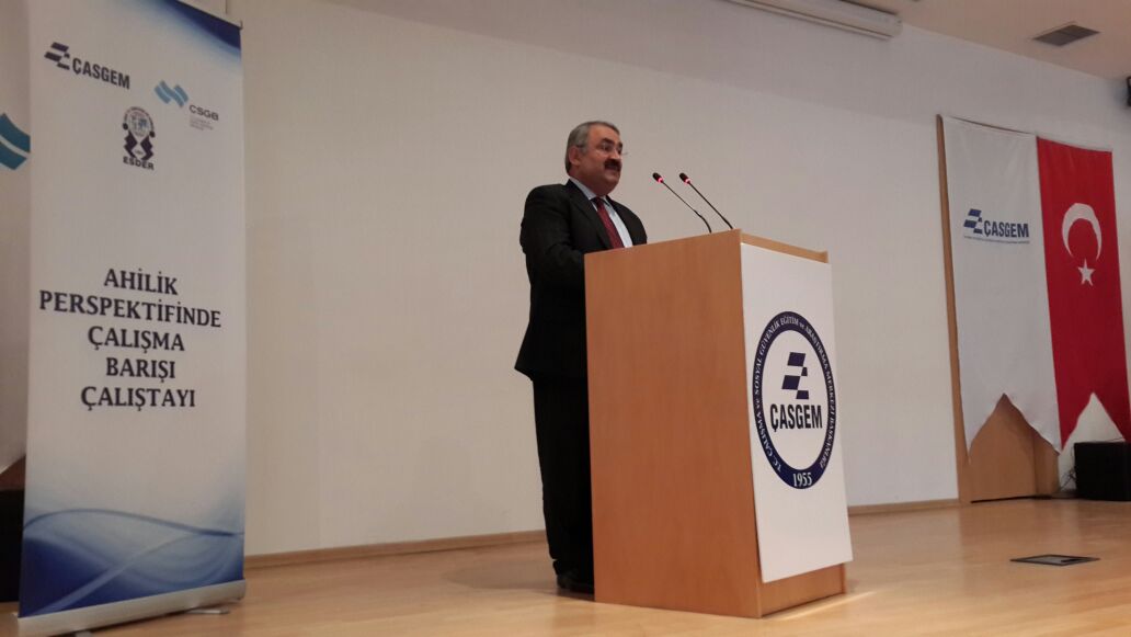 Çalışma ve Sosyal Güvenlik Bakanlığı Eğitim ve Araştırma Merkezi (ÇASGEM), Çalışma Genel Müdürlüğü ve Esnaf ve Sanatkarlar Derneği’nin ortaklaşa düzenlediği ‘Ahilik Perspektifinde Çalışma Barışı’ çalıştayına, Çalışma ve Sosyal Güvenlik Bakan Yardımcısı Halil Etyemez, ÇASGEM Başkanı İsmail Akbıyık, Esnaf ve Sanatkarlar Derneği Başkanı Mahmut Çelikus, TÜBA Başkanı Prof. Dr. Ahmet Cevat Acar ve akademisyenler ile diğer yetkililer katıldı.