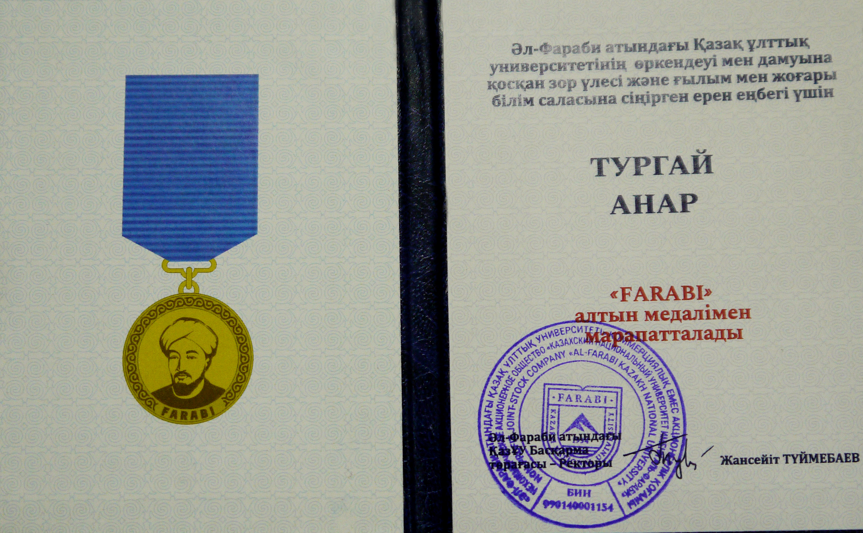 TÜBA’nın yaptığı faaliyetlerle ilgili Prof. Anar’dan bilgi alan Rektör Tüymebayev, TÜBA ile Kazakistan’da ve özellikle de Al- Farabi Üniversitesi’nde ortak program ve projeler yürütmek üzere iş birliğine açık olduğunu söyledi. Prof. Tüymebayev “Al- Farabi Üniversitesinin gelişimi ve ilerlemesine yaptığı büyük katkı ile bilim ve yükseköğretim alanındaki üstün hizmetleri” dolayısıyla Prof. Anar’ı Farabi Altın Madalyasıyla ödüllendirildi.