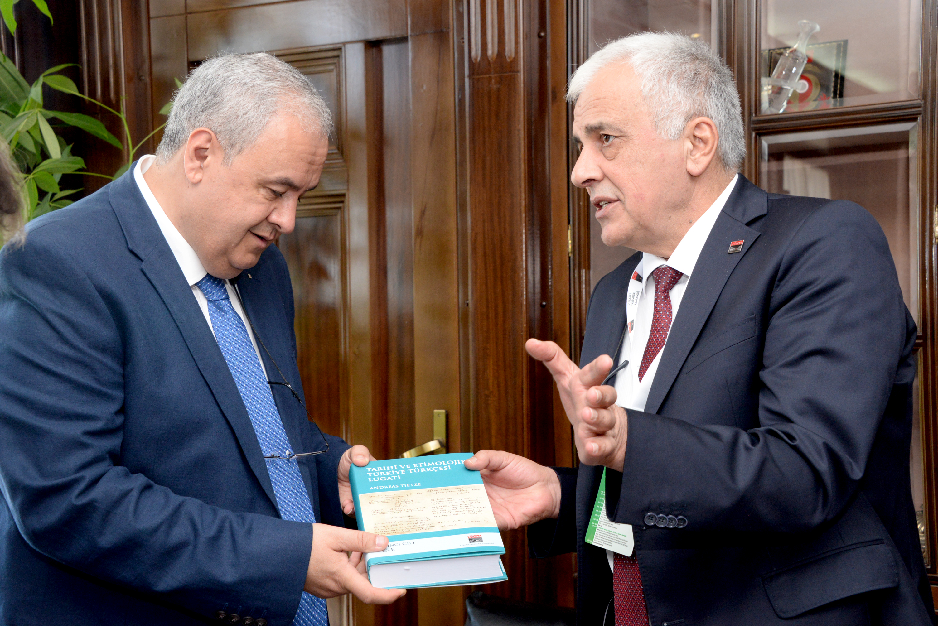 TÜBA Başkan Yardımcısı Prof. Dr. Ahmet Nuri Yurdusev’in de bulunduğu ziyarette Prof. Acar, Prof. Kök’e Akademi tarafından yayımlanan TÜBA Şeref Üyesi Prof. Dr. Fuat Sezgin’in “İslam’da Bilim ve Teknik” adlı eserini ve yine Akademi tarafından geçtiğimiz günlerde baskısı gerçekleştirilen TÜBA Şeref Üyesi Prof. Dr. Andreas Tietze’nin eseri “Tarihi ve Etimolojik Türkiye Türkçesi Lugati”ni armağan etti.
