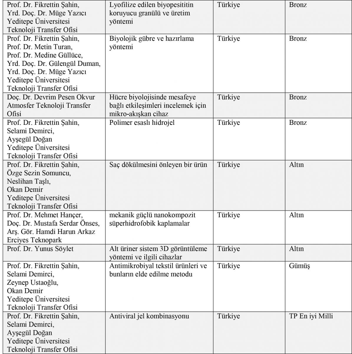 “Lyofilize edilen biyopesititin koruyucu granülü ve üretim ile biyolojik gübre ve hazırlama yöntemleri, polimer esaslı hidrojel, saç dökülmesini önleyen bir ürün, antimikrobiyal tekstil ürünleri ve bunların elde edilme metodu ve antiviral jel kombinasyonu” buluşları ile fuarda yer alan Prof. Dr. Fikrettin Şahin en fazla ödül kazanan isim oldu. Prof. Dr. Yunus Söylet de “alt üriner sistem 3D görüntüleme yöntemi ve ilgili cihazlar” hakkındaki çalışmasıyla madalya sahibi bilim insanları arasında yer aldı. TÜBA-GEBİP Üyeleri Doç. Dr. Mustafa Serdar Önses’in “mekanik güçlü nanokompozit süperhidrofobik kaplamalar” ve Doç. Dr. Devrim Pesen Okvur’un ise “hücre biyolojisinde mesafeye bağlı etkileşimleri incelemek için mikro-akışkan cihaz” buluşu da ödüle layık görüldü.