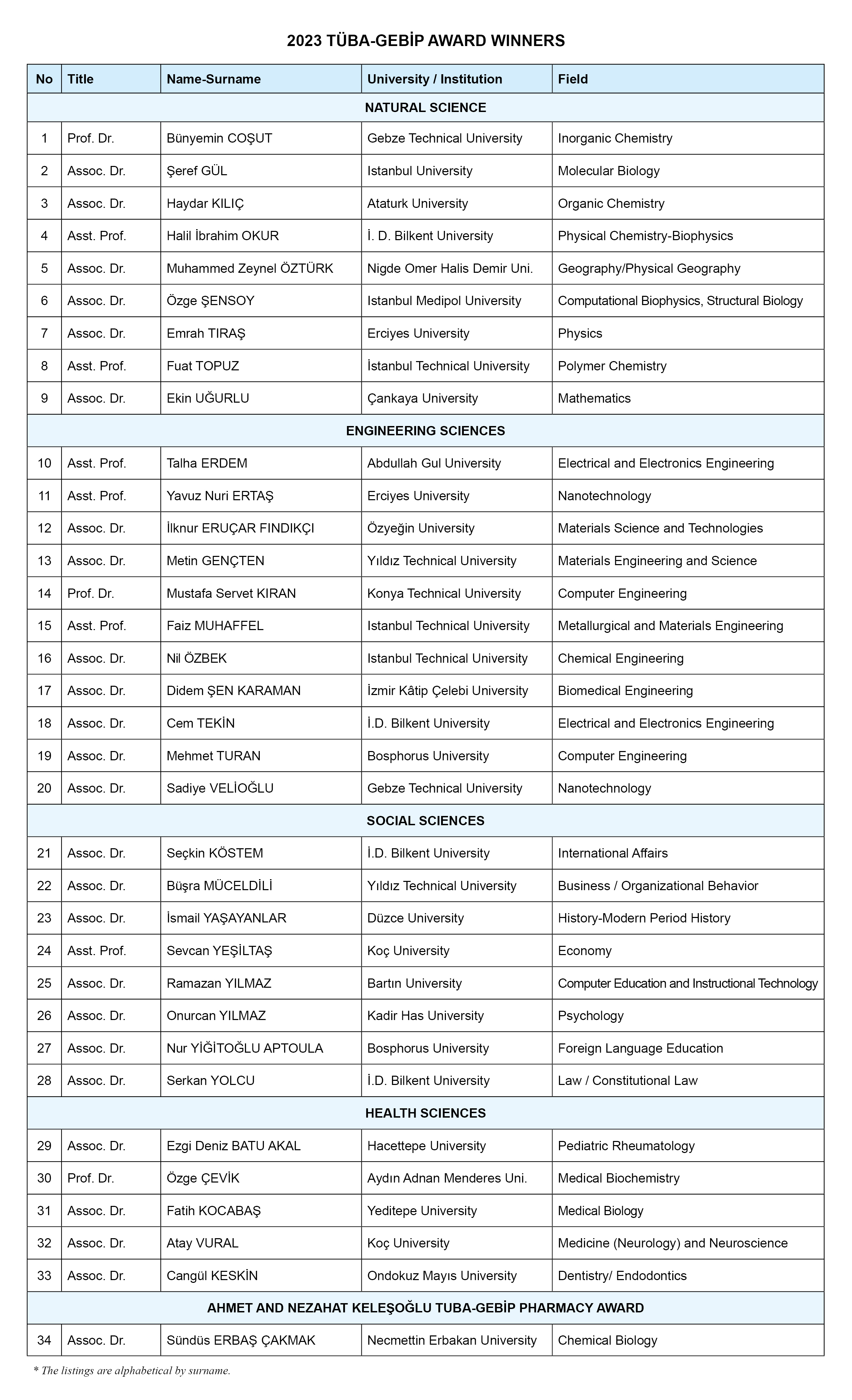 In 2023, a total of 34 exceptionally successful young scientists from 24 different universities, including the Ahmet and Nezahat Keleşoğlu TÜBA-GEBİP Pharmacy Special Award, won the TÜBA-GEBİP Award. This award holds special significance for promoting Türkiye in the international scientific community and fostering relationships, as well as encouraging young scientists to continue their research in Türkiye. With these new awardees, the total number of scientists who have received the TÜBA-GEBİP Award has now risen to 644.