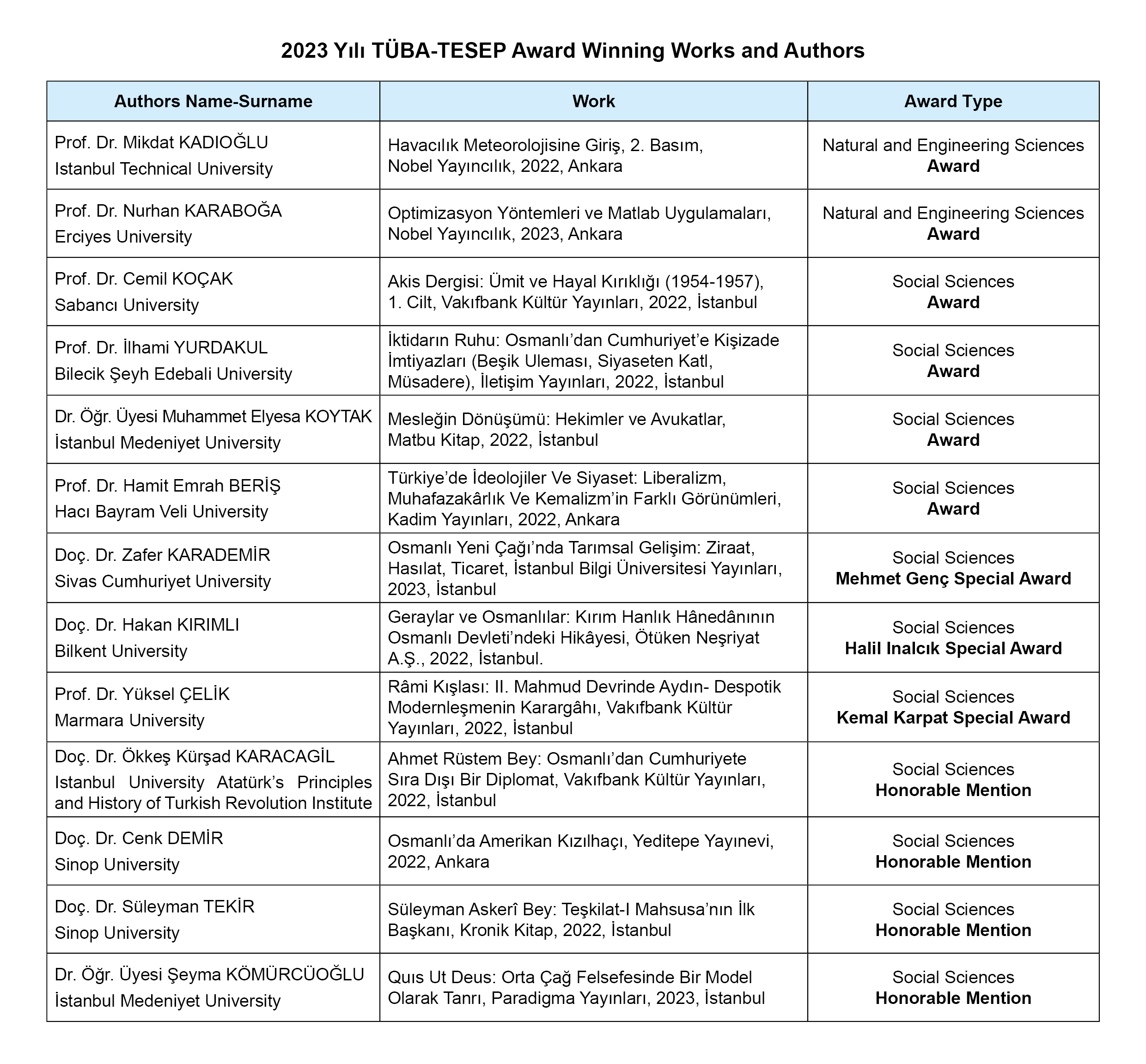 Within the scope of the Scientific Authored Book (TESEP), which aims to encourage the production of qualified copyrighted works for universities; In 2023, a total of 9 works were found worthy of awards, including 2 works in the field of Natural and Engineering Sciences, 4 works in the field of Social Sciences, 1 work with Halil İnalcık Special Award, 1 work with Mehmet Genç Special Award and 1 work with Kemal Karpat Special Award. In addition, 4 works in the field of Social Sciences were given the Noteworthy Work (Honorable Mention) Award. In 2023, 13 works were awarded in this context and the number of works awarded within the scope of TESEP has increased to 239.
