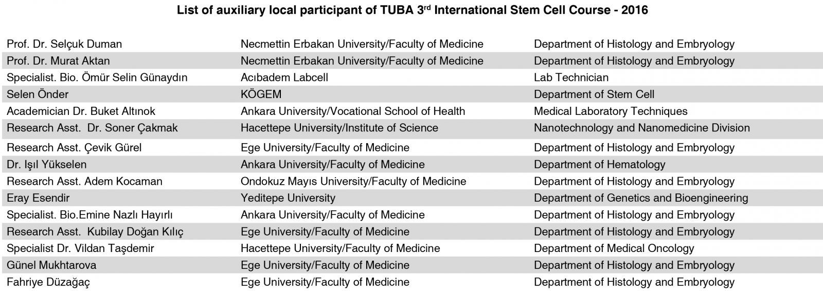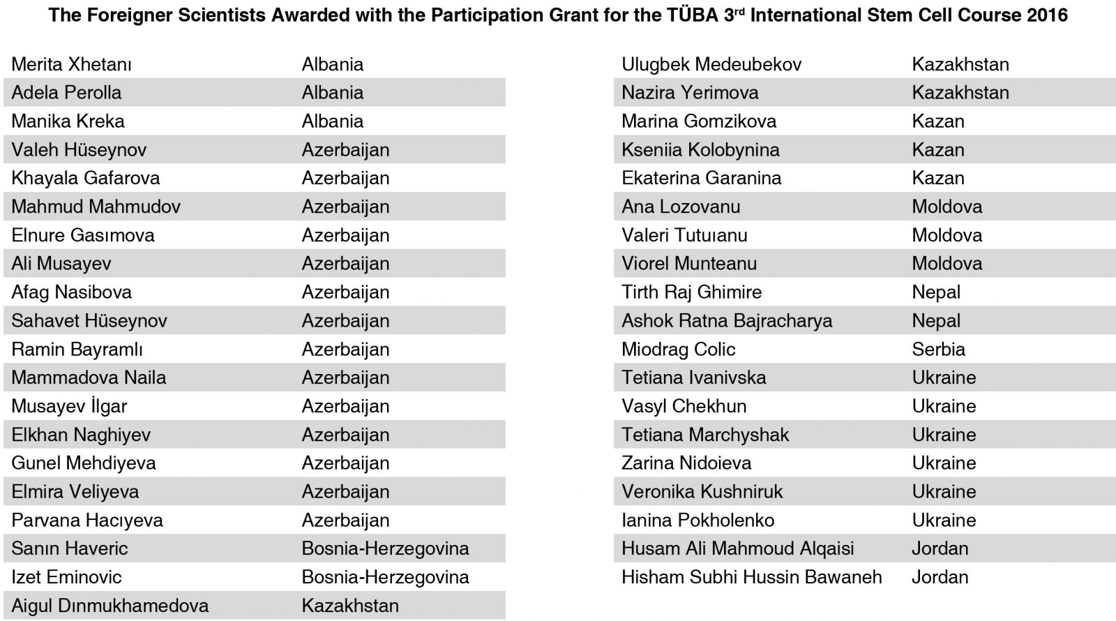 The domestic and international scientists awarded with TÜBA and TIKA (Turkish Cooperation and Coordination Agency) grant for participation to the 3rd International Stem Cell Course to be organized in Spice Hotel, Antalya on May 19-22 by the Turkish Academy of Sciences: “Innovative Cell Therapies in Hematologic-Oncology” are announced.