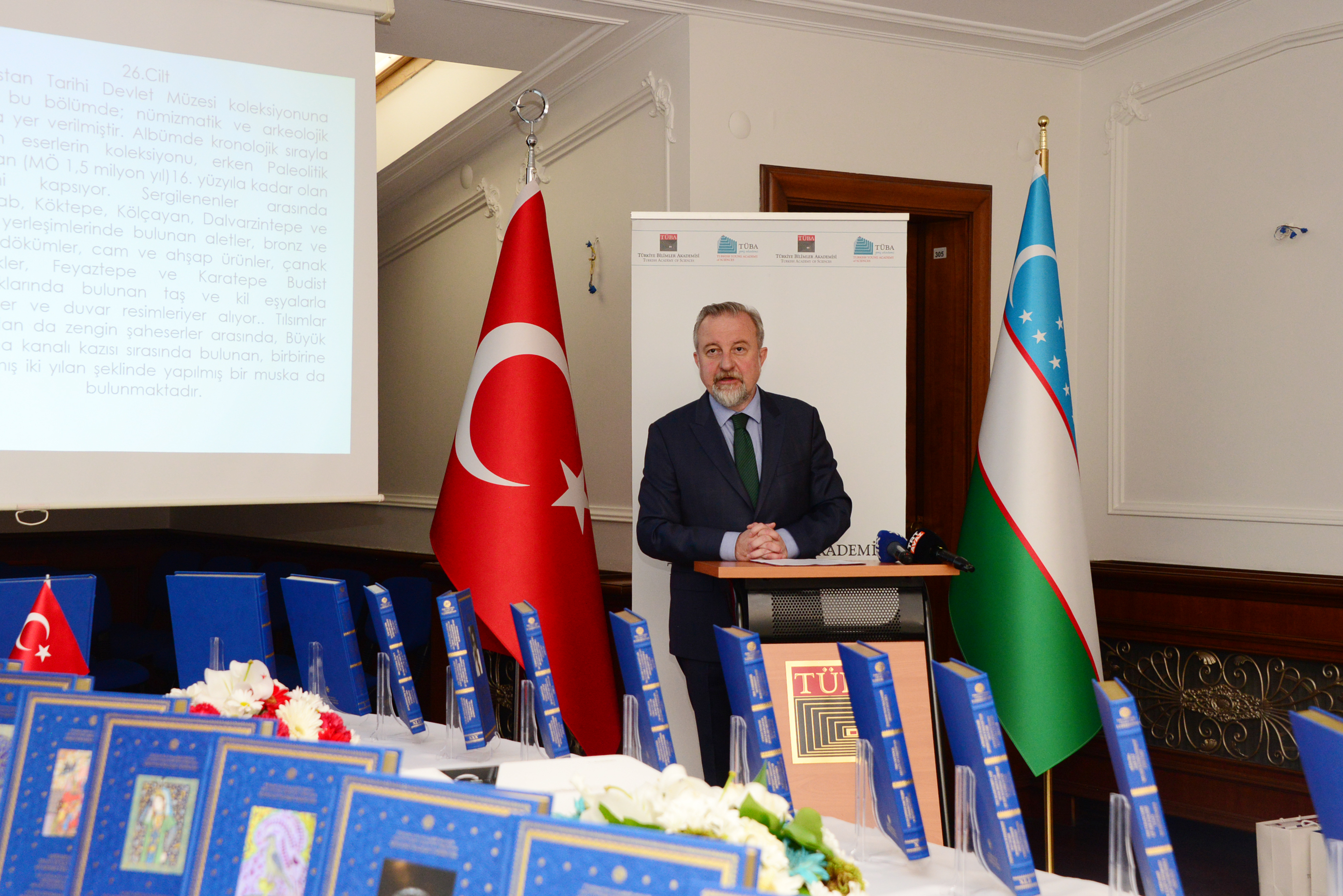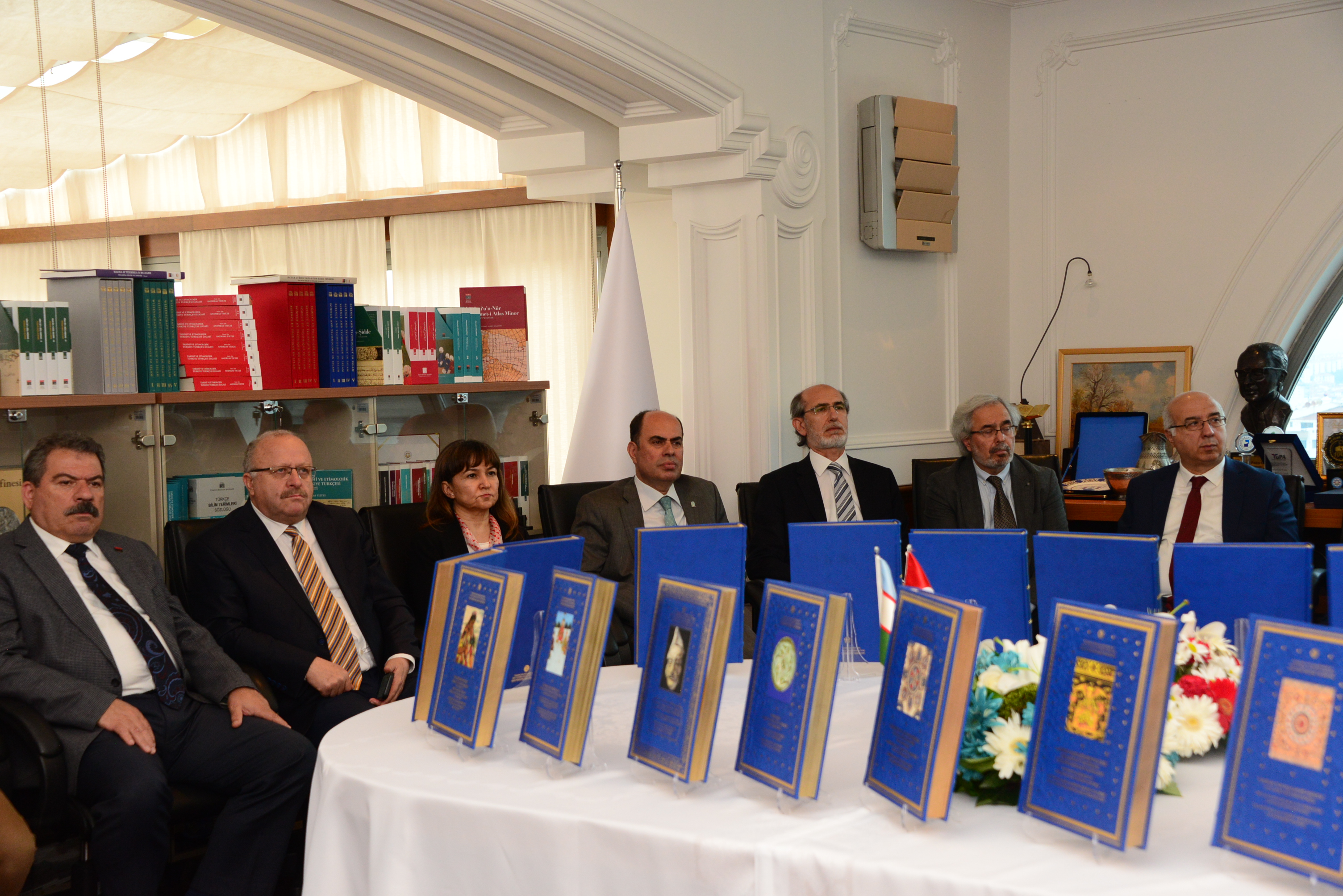 The book collection consisting of 50 volumes published as part of the project "Dünya Yazma Eser Koleksiyonlarında Özbekistan’ın Kültürel Mirası" under the auspices of Uzbek President Shavkat Mirziyoyev, which can only be found in the Topkapı Palace Museum in Türkiye, was presented to the President of the Academy Prof. Muzaffer Şeker by Ambassador of Uzbekistan to Ankara Alişer Azamhocayev.