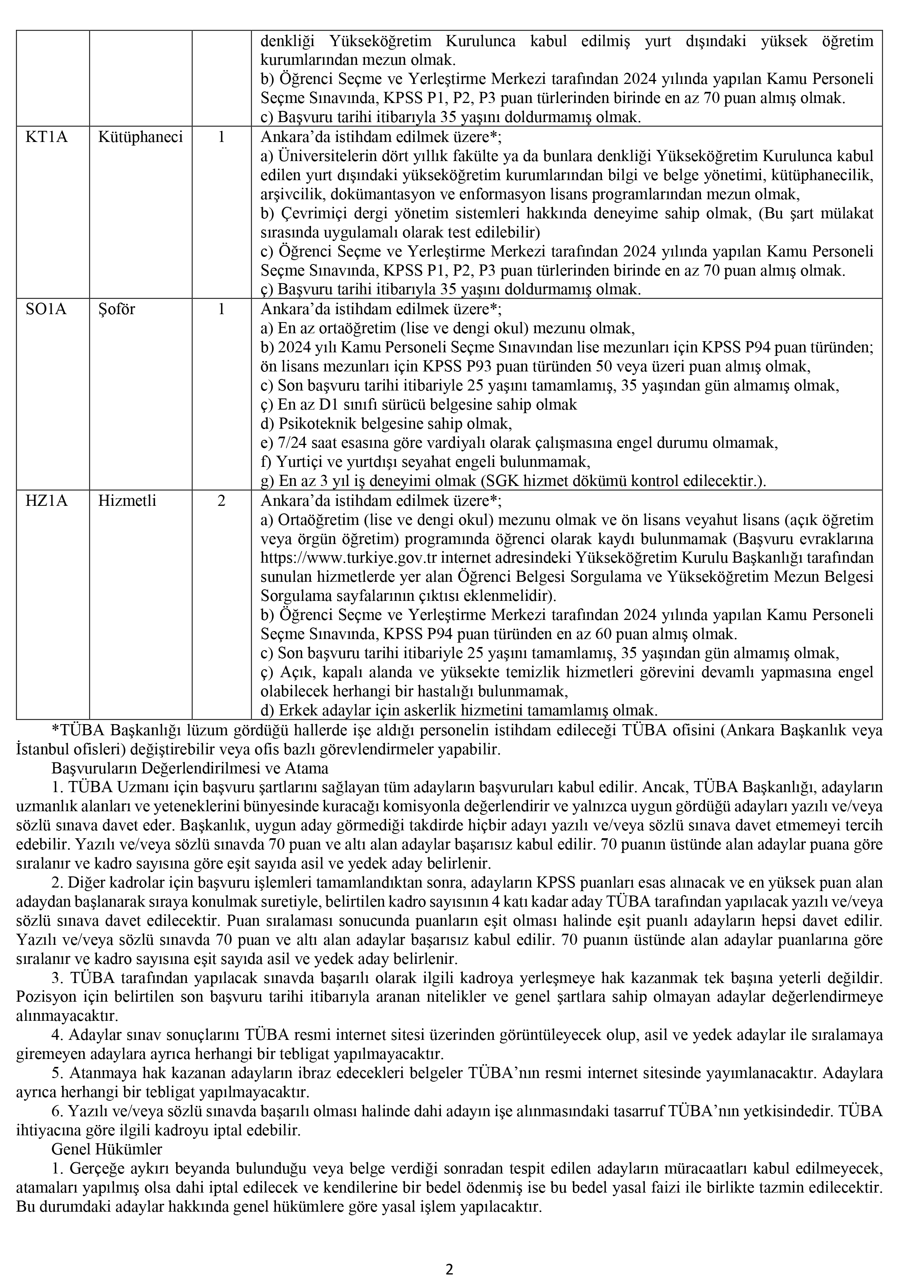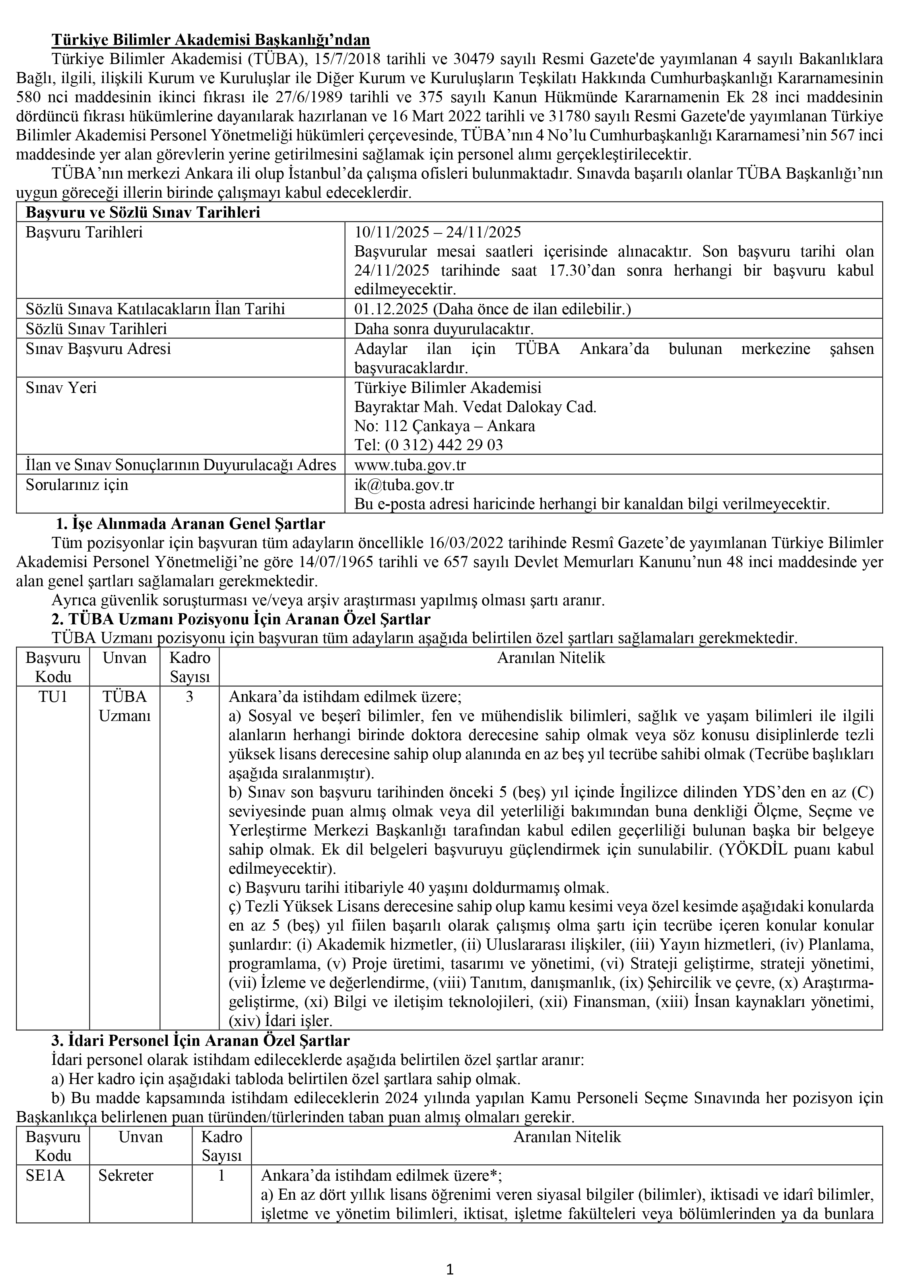 Türkiye Bilimler Akademisi (TÜBA), 15/7/2018 tarihli ve 30479 sayılı Resmi Gazete'de yayımlanan 4 sayılı Bakanlıklara Bağlı, ilgili, ilişkili Kurum ve Kuruluşlar ile Diğer Kurum ve Kuruluşların Teşkilatı Hakkında Cumhurbaşkanlığı Kararnamesinin 580 nci maddesinin ikinci fıkrası ile 27/6/1989 tarihli ve 375 sayılı Kanun Hükmünde Kararnamenin Ek 28 inci maddesinin dördüncü fıkrası hükümlerine dayanılarak hazırlanan ve 16 Mart 2022 tarihli ve 31780 sayılı Resmi Gazete'de yayımlanan Türkiye Bilimler Akademisi Personel Yönetmeliği hükümleri çerçevesinde, TÜBA’nın 4 No’lu Cumhurbaşkanlığı Kararnamesi’nin 567 inci maddesinde yer alan görevlerin yerine getirilmesini sağlamak için personel alımı gerçekleştirilecektir. TÜBA’nın merkezi Ankara ili olup İstanbul’da çalışma ofisleri bulunmaktadır. Sınavda başarılı olanlar TÜBA Başkanlığı’nın uygun göreceği illerin birinde çalışmayı kabul edeceklerdir.