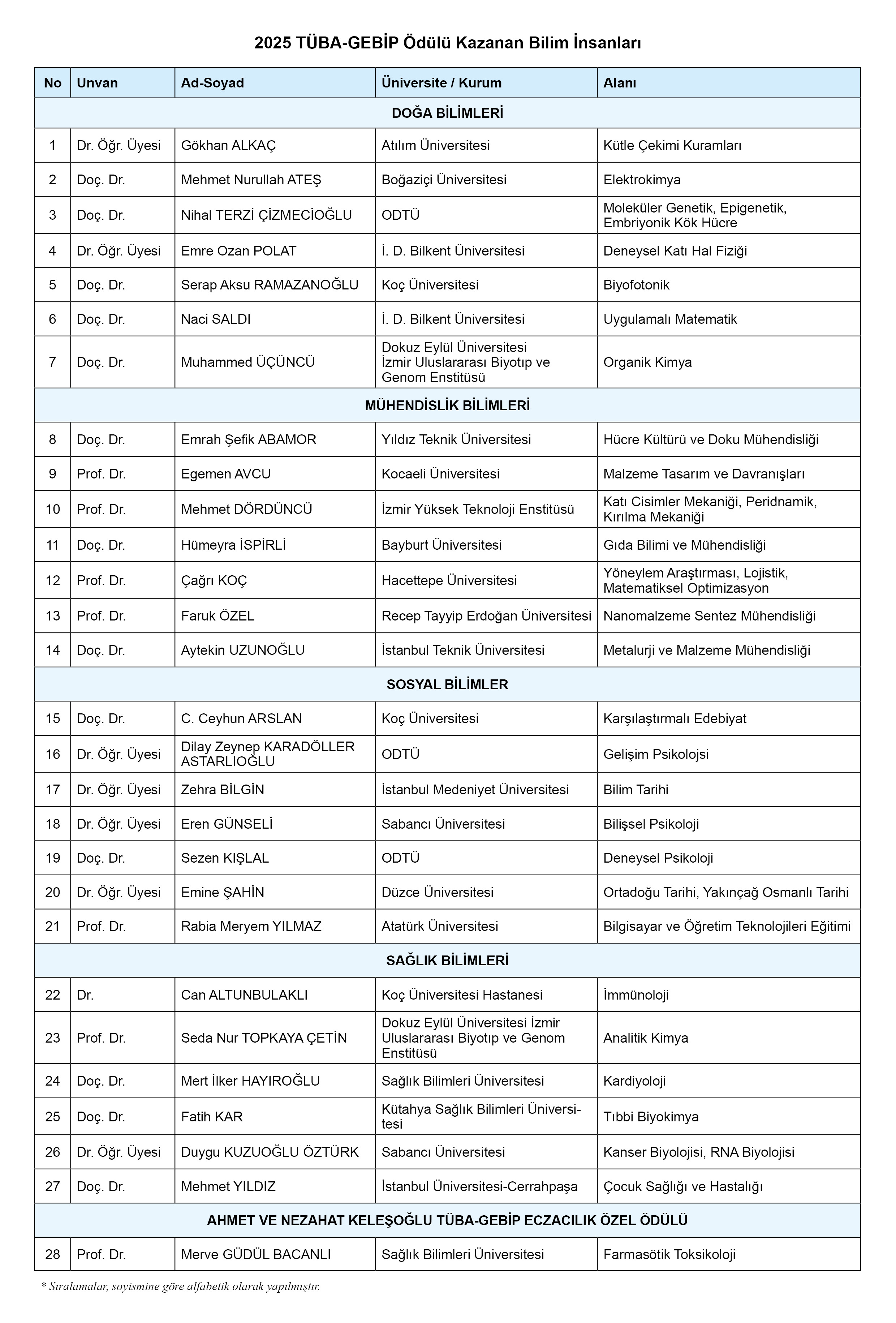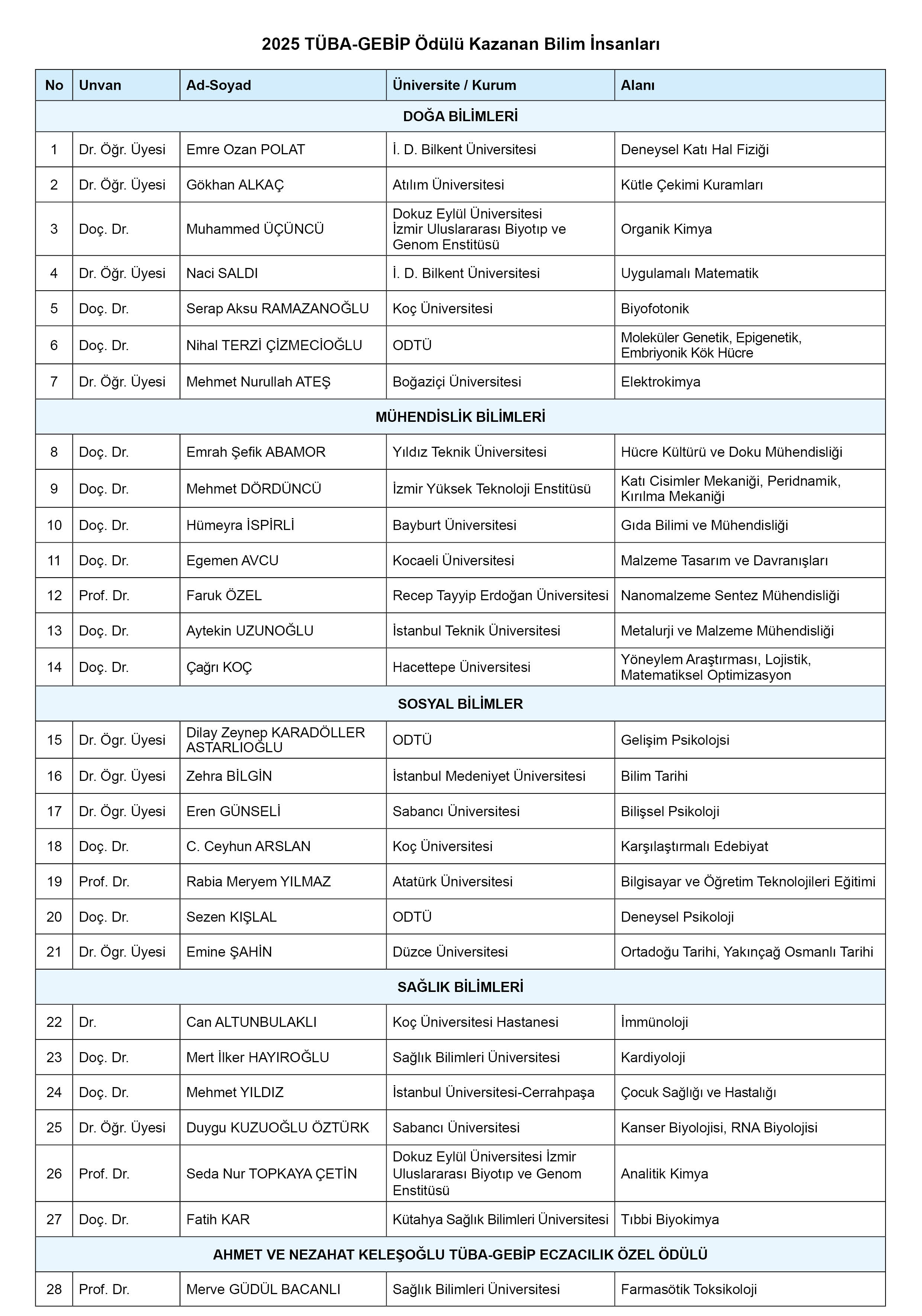 Türkiye’nin uluslararası bilim camiasındaki tanıtımı ve ilişkileri, üstün başarılı genç bilim insanlarının teşviki ve çalışmalarını Türkiye’de sürdürmeleri bakımından özel bir öneme sahip olan TÜBA-GEBİP Ödülü’nü 2025 yılında; Ahmet ve Nezahat Keleşoğlu TÜBA-GEBİP Eczacılık Özel Ödülü de dahil 28 üstün başarılı genç bilim insanı kazandı. Böylece şimdiye kadar TÜBA-GEBİP Ödülü kazanan bilim insanı sayısı 697’ye yükseldi.