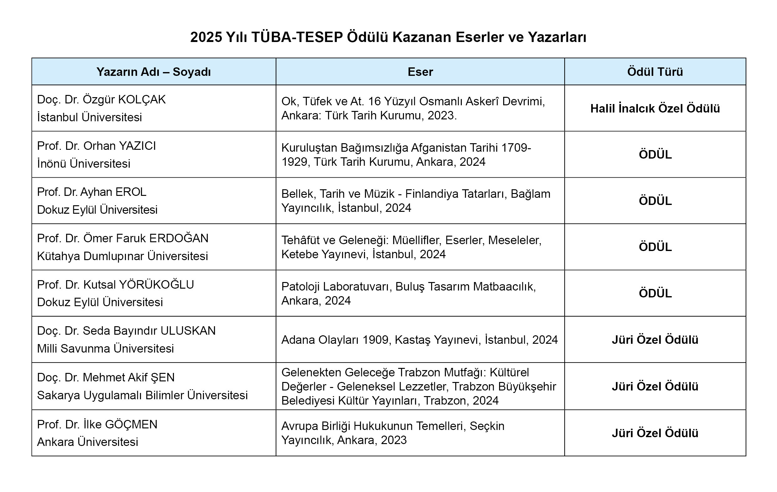 TÜBA-TESEP kapsamında Sosyal Bilimler alanında 4 esere Telif Eser Ödülü ve 1 esere Halil İnalcık Özel Ödülü, 3 esere Jüri Özel Ödülü olmak üzere toplam 8 eser ödüle değer bulundu. 2025 yılında toplam 8 eser ödüllendirildi ve bugüne kadar ödüllendirilen eser sayısı 253'e yükseldi.