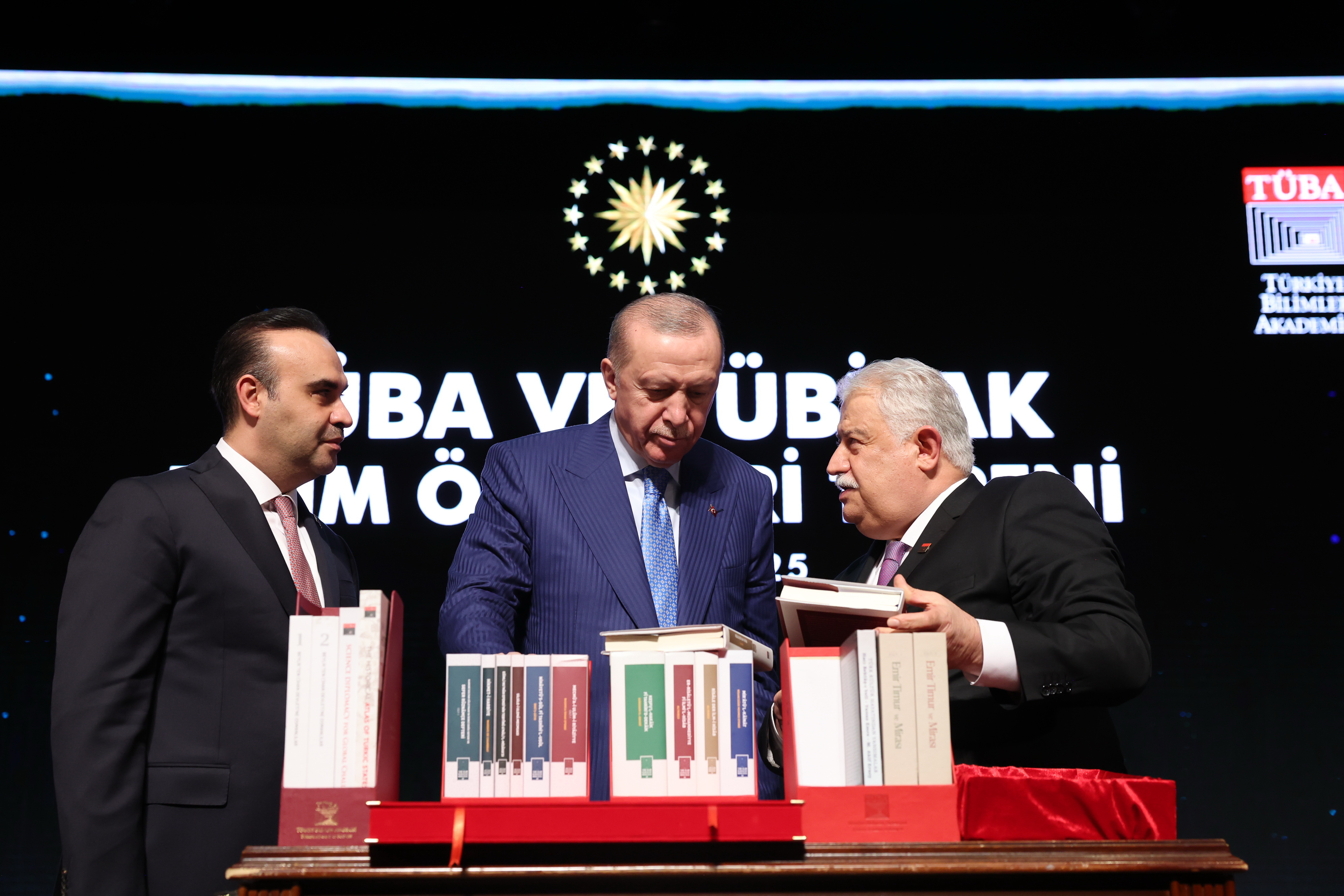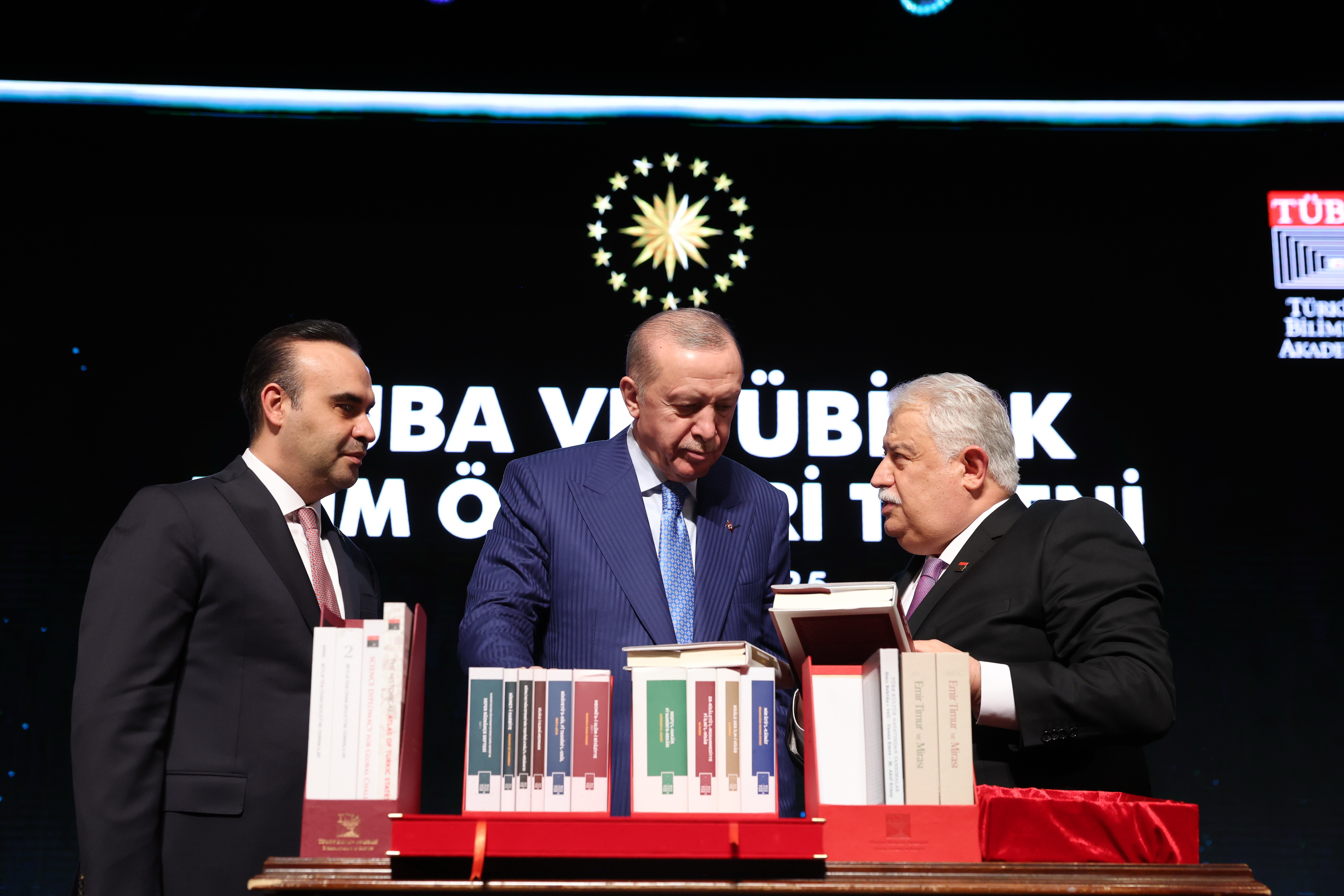 Protokol konuşmalarının ardından Sanayi ve Teknoloji Bakanı Mehmet Fatih Kacır ve TÜBA Başkanı Prof. Dr. Muzaffer Şeker tarafından Cumhurbaşkanı Erdoğan’a Türk-İslam Bilim Kültür Mirası (TİBKM) Projesi kapsamında 2025 yılı itibarıyla tamamlanan 70 eserin özet bilgileri içeren dokümanları ile eserlerin açık kaynak olmak üzere hazırlanan dijital versiyonlarından oluşan çalışma takdim edildi. Ayrıca TÜBA’nın 2025 yılında yayımladığı Türkçe ve İngilizce eserler arasında bulunan Türk Devletleri Tarih Atlası (The Historical Atlas of Turkic States), Küresel Sorunlar İçin Bilim Diplomasisi (Science Diplomacy for Global Challenges), 2 ciltlik Emir Timur ve Mirası ile Beylikten Cihan Devletine Osmanlılar adlı yayınlardan oluşan bir seçki de sunuldu. Türk-İslam Bilim Kültür Mirası eserleri arasında Ali Kuşçu’nun değerli çalışmalarının da yer aldığı özellikle belirtildi ve eserlerin Birleşmiş Milletler UNESCO 2024 Ali Kuşçu Yılı’na ilişkin bilimsel etkinliklerin bir halkası olarak bilim dünyası ile paylaşıldığı bilgisi verildi.