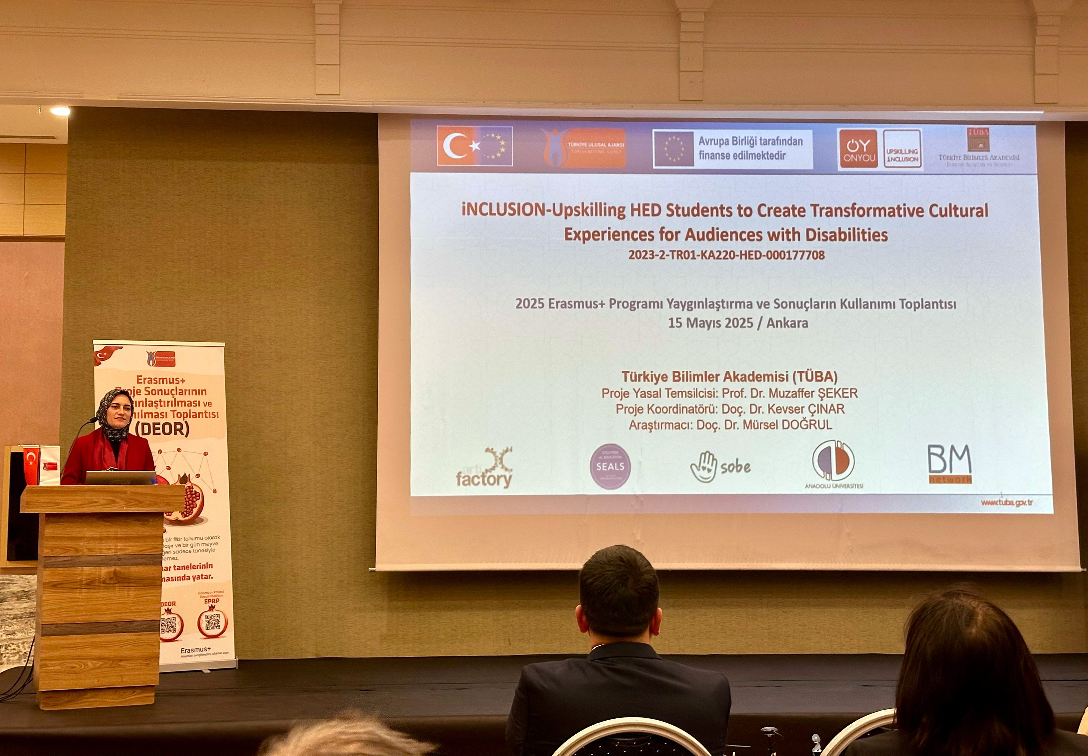 Toplantının tecrübe paylaşımı oturumlarında, iNCLUSION Projesinin Koordinatörü TÜBA Başkan Danışmanı Doç. Dr. Kevser Çınar TÜBA’nın koordinasyonunda yürütülen "Upskilling HED Students to Create Transformative Cultural Experiences for Audiences with Disabilities" başlıklı Erasmus+ projesini sundu; projenin hedef kitlesi, yenilikçi eğitim yöntemleri ve yaygınlaştırma stratejilerini katılımcılarla paylaştı. Dr. Çınar’ın sunumu, Avrupa Birliği destekli projelerinin sürdürülebilirliği ve sosyal etki üretimi açısından ve özellikle kapsayıcılık ve erişilebilirlik temaları çerçevesinde yürütülen çalışmaların farklı kurumlarla iş birliği potansiyelini artırıyor olması bakımından dikkat çekti.