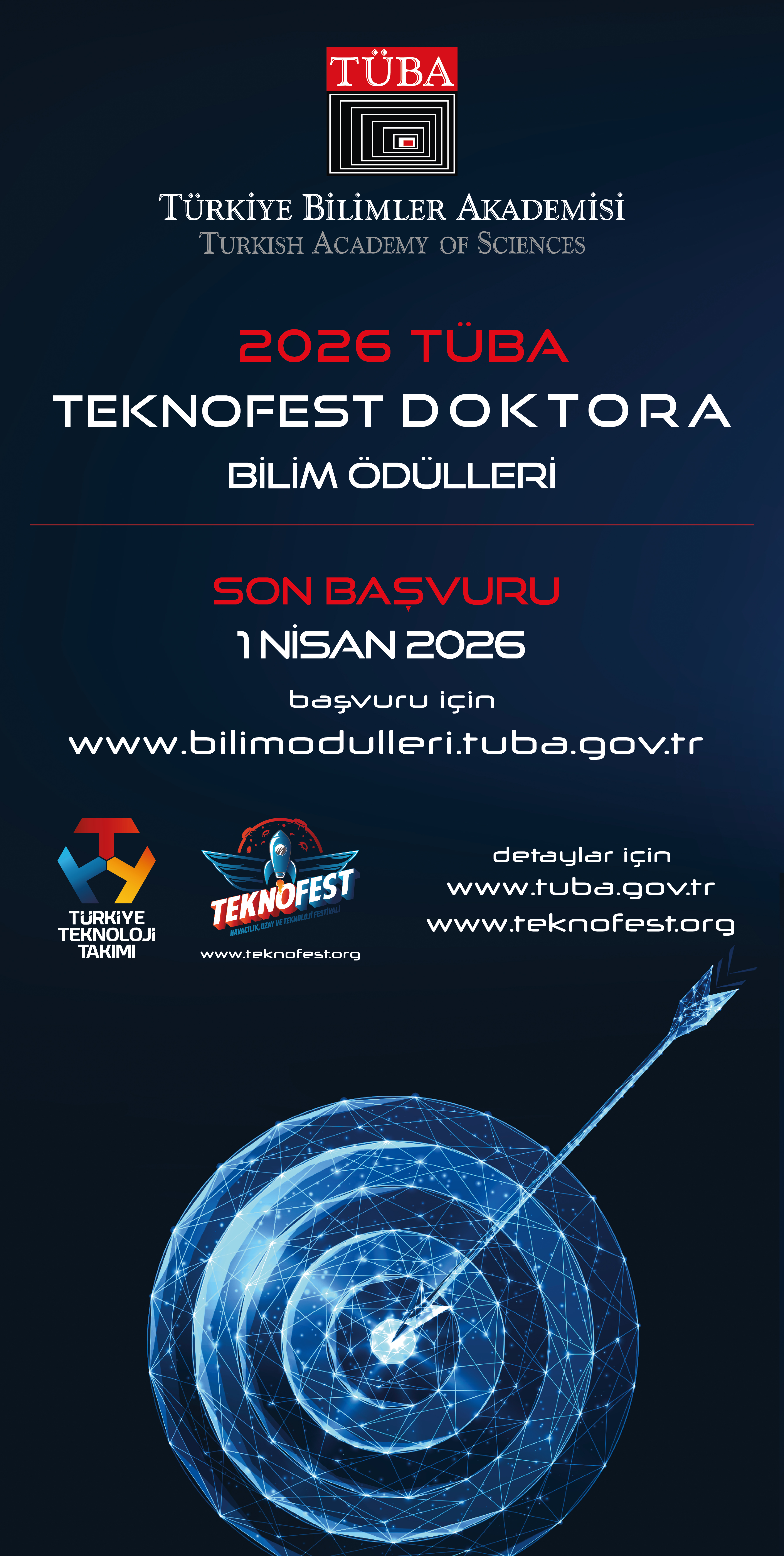 TÜBA, paydaşı olduğu TEKNOFEST kapsamında yürüttüğü TÜBA-TEKNOFEST Doktora Bilim Ödül programının 2026 yılı başvuruları gelen yoğun talep üzerine 1 Nisan 2026 günü saat 17:00'ye kadar uzatıldı.